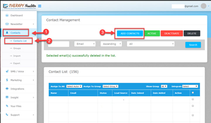 1. Click on Contacts, Contacts List then Add Contacts. Click on Continue after reading the terms on the pop-up