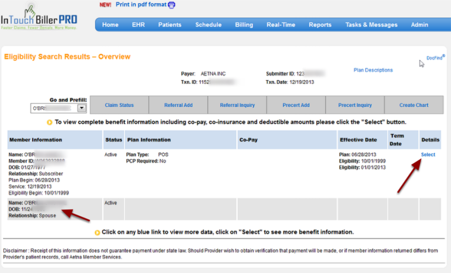 The patient information will appear and you can choose "Select" on the right side to view the patient's complete benefit information including co-pay, co-insurance and deductible amounts.
