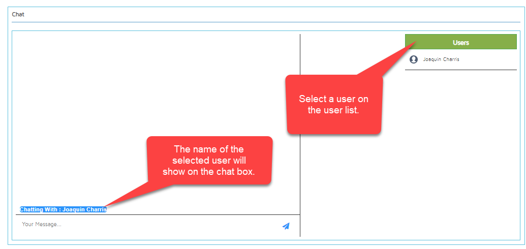 2. Select any user on the user list. The selected user's name will appear on the chatbox indicating the person you are messaging.