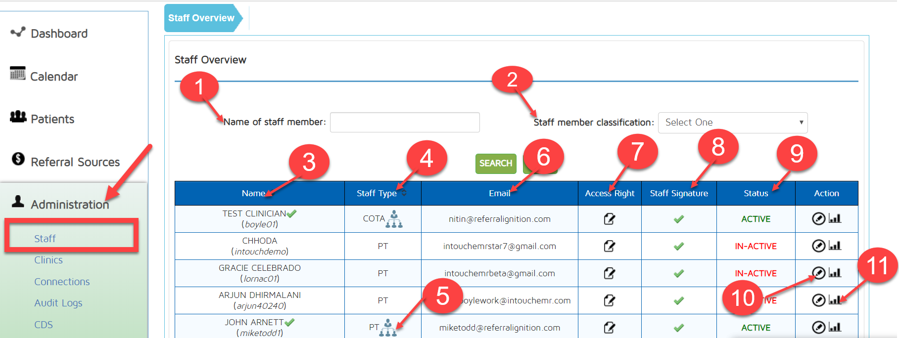 - Staff Type - This column shows what type / classification is this user under. Example, PT, COTA, front desk or other.