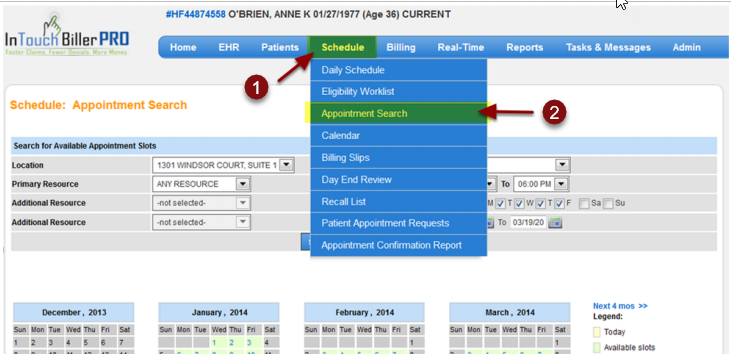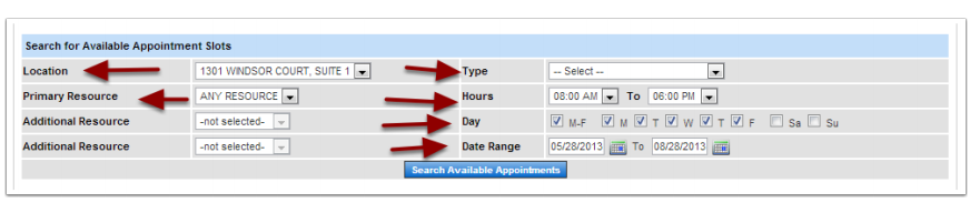 The Appointment Search feature is a convenient way to search for an available appointment by location, resource, appointment type, hours, day, and date range. It also allows the user to conveniently search for multiple resources, along with different days and times.
