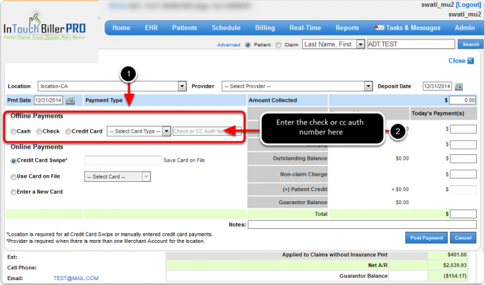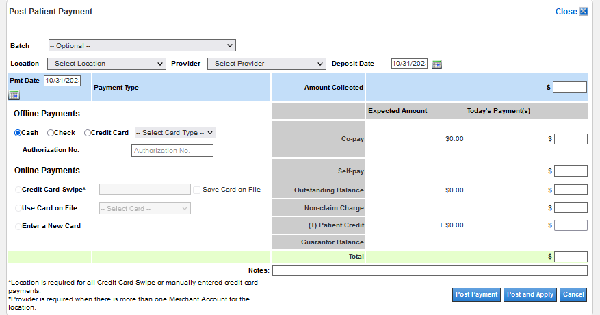 Note: Disperse the amount collected to the applicable fields, e.g., Co-pay, Self-pay, Outstanding Balance, etc.