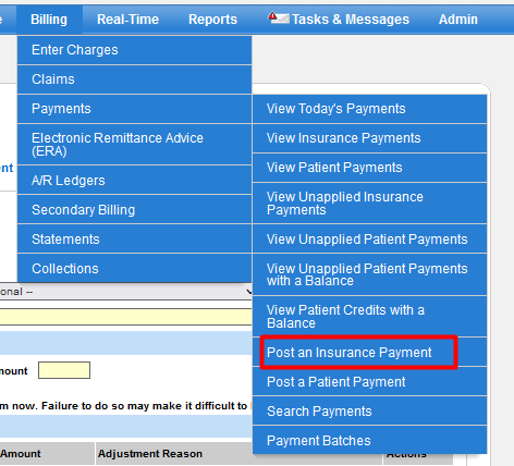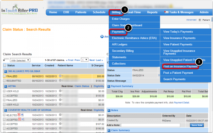 Hover over (1) Billing, select (2) Payments, and then click (3) Post an Insurance Payment