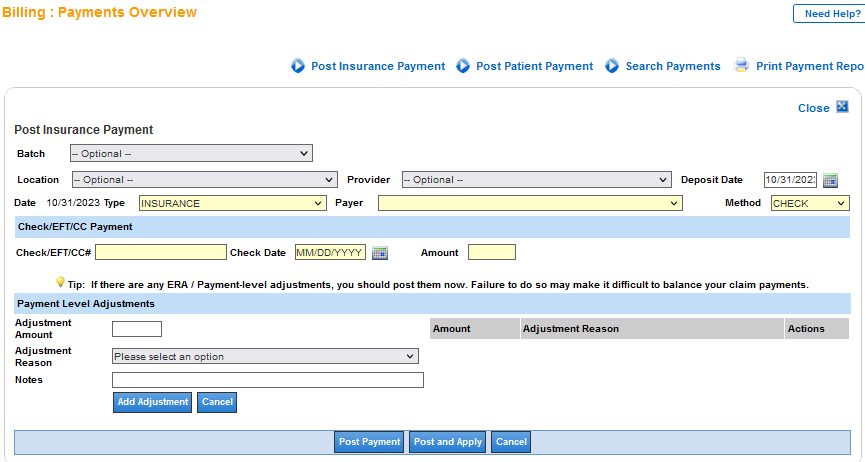 Note: It is important to confirm that “Payment Level Adjustments” are posted before applying to claims or the check will not balance and will have to be voided and the user will have to start all over again. It is assumed that the “Posting an Insurance Payment – Manually” training document has been reviewed.