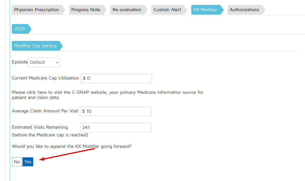 Answer "Yes" or "No" to append the KX modifier to your claims going forward. We recommend you turn this option on if you think you are close to your Medicare Cap.