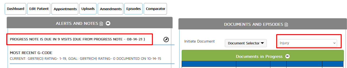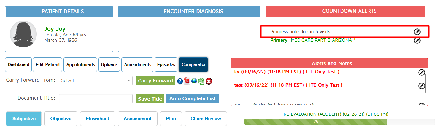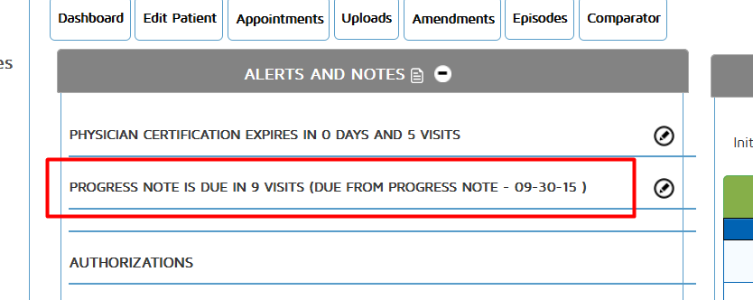 For maximum accuracy, the progress note should be associated with a date of service. Once it is set up, the progress note alert starts counting down, based on the most recent initial evaluation or the most recent progress note.