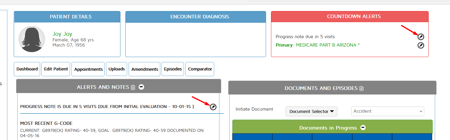 The edit icon when clicked automatically directs to the Edit Patient screen under the alerts tab. This will allow users to edit the alerts.
