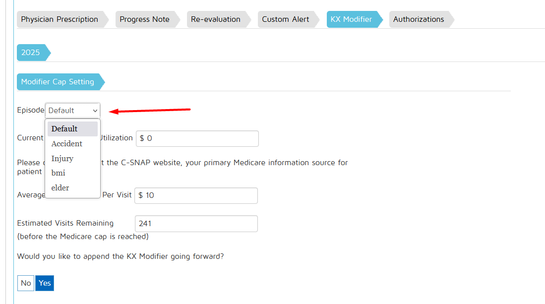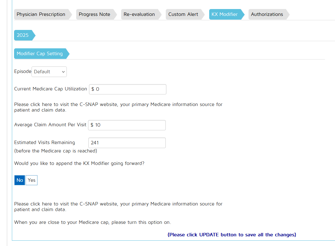 The system will put an alert on the Patient Dashboard and count down as visits are documented for, and alert you when the Cap has been reached (based on the estimated data you entered). If you think you may be close to the cap we suggest that you turn on the KX Modifier for all claims going forward.