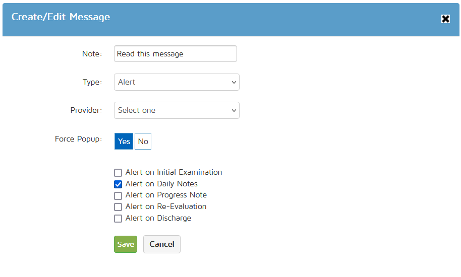 You also have the option to enable the Force Pop Up Alert, which will force you to complete a reevaluation Note before you are allowed to continue on based on when you set your notes to be due (example: re-evaluation is due every 3 days, the third day the system will force you to complete the re-evaluation note.)