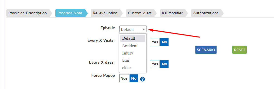 Choose which episode you would like to set up the alert for. Example: PT episode will have 2 visits remaining before a Progress Note is due while in the OT episode there are 5 visits remaining.