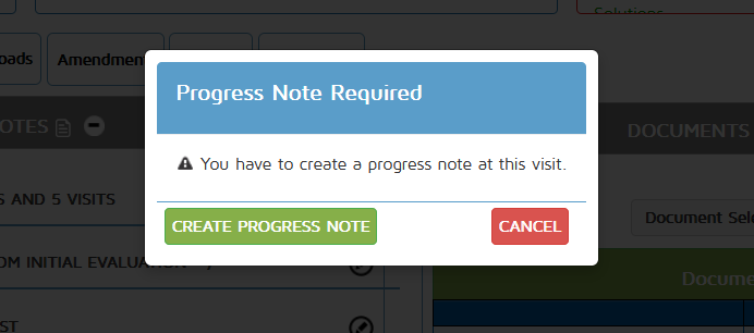 When the Force Popup is enabled, you will see this alert on the screen, forcing you to complete a Progress Note for that patient before you can continue documenting that episode of care.