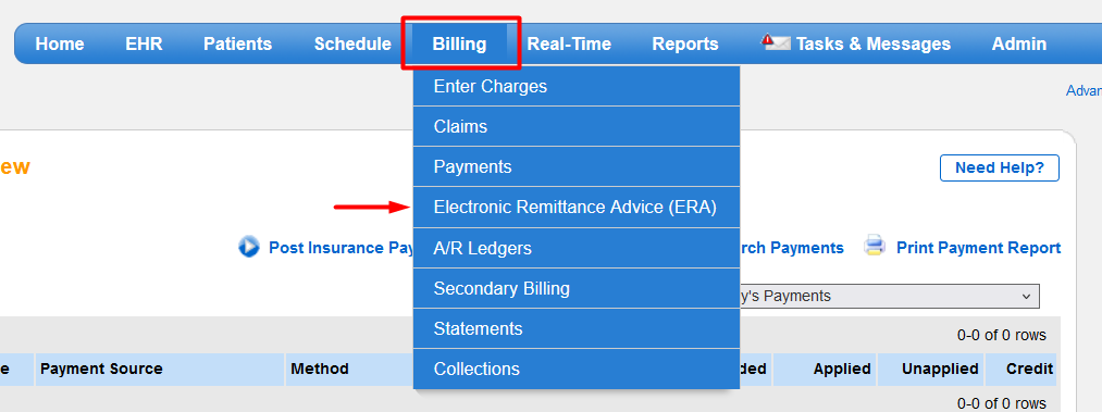 - From the menu bar, hover your cursor over Billing and then click Electronic Remittance Advice (ERA).