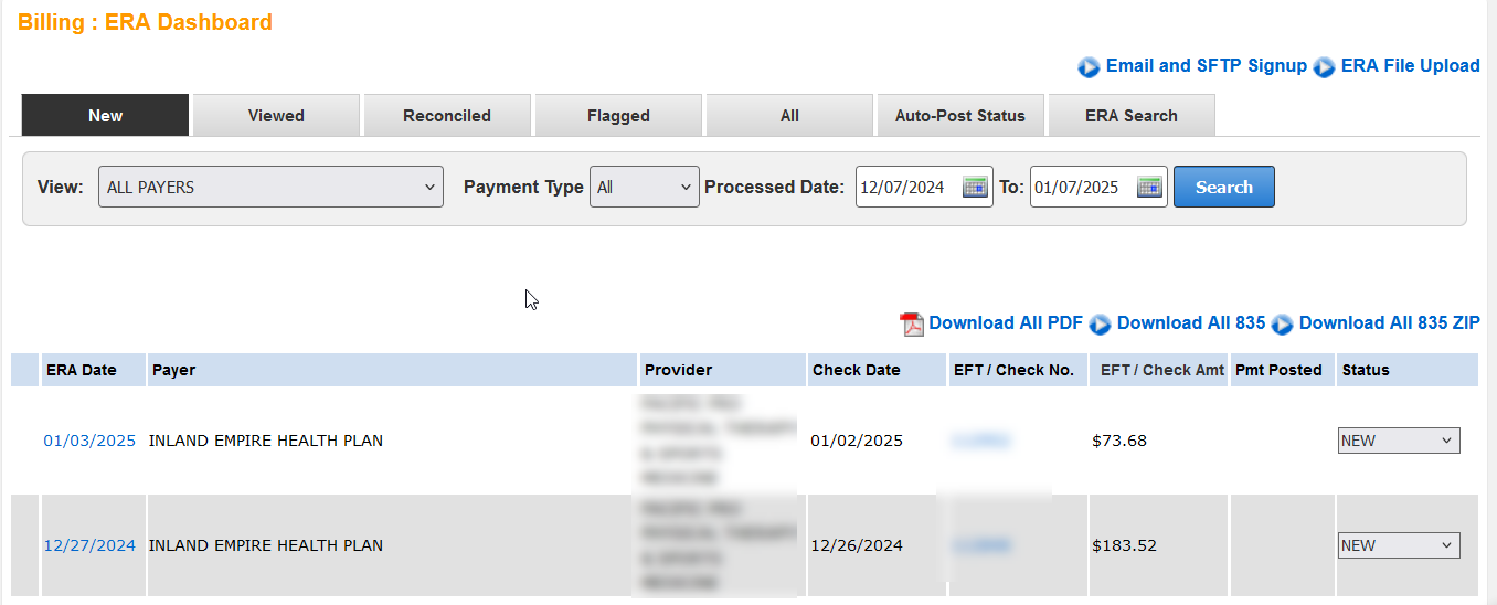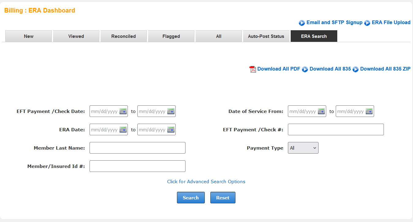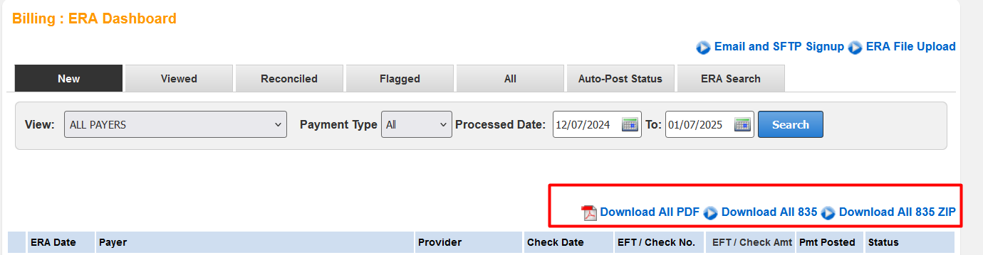 - Download All 835: Download multiple ERAs into 835 ANSI format.