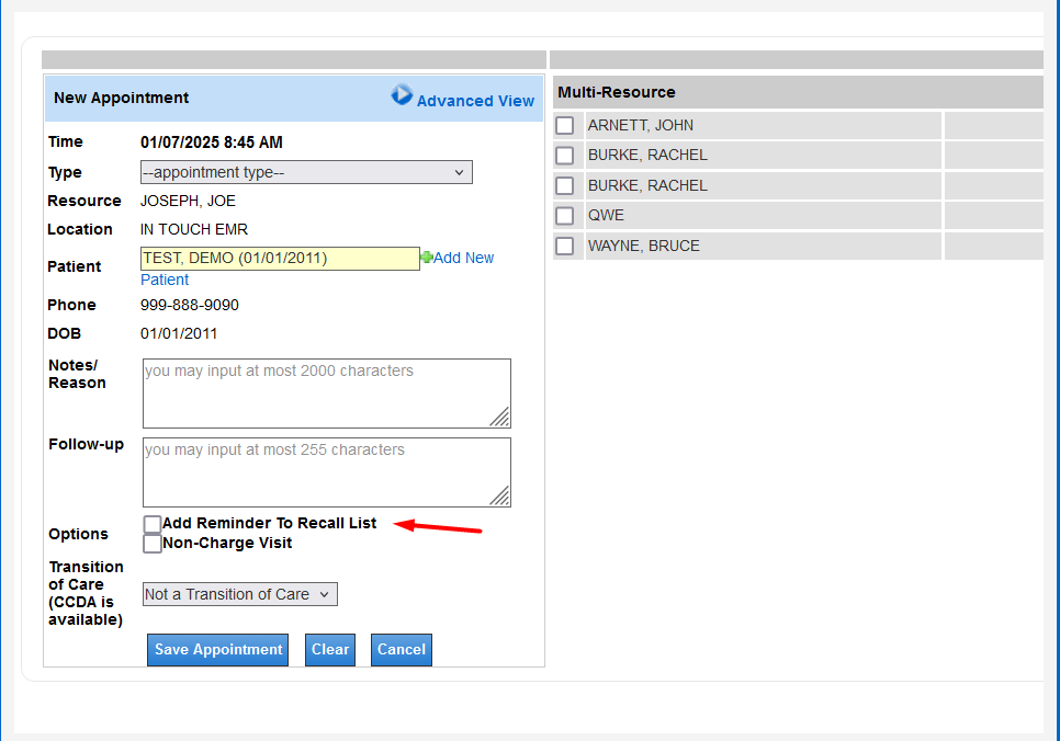 - Check the box to add the patient to the “Recall List” as an appointment reminder.