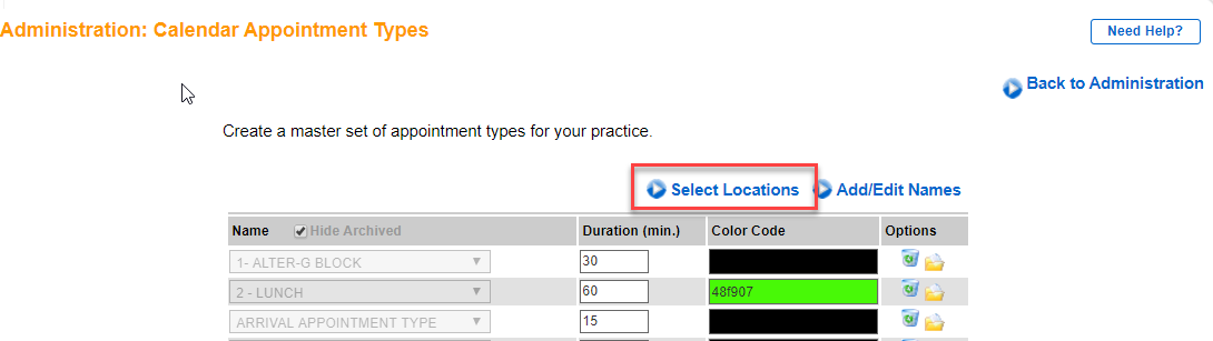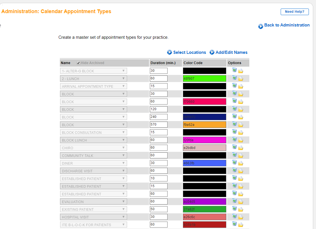 Note: Upon navigating to this page, you will see several preloaded options for appointments. All appointment lengths must be in minutes. Any appointment type may be used multiple times as long as the length of time differs. Each appointment type also has the option to add a color code for easy recognition while viewing the schedule in the Calendar view.