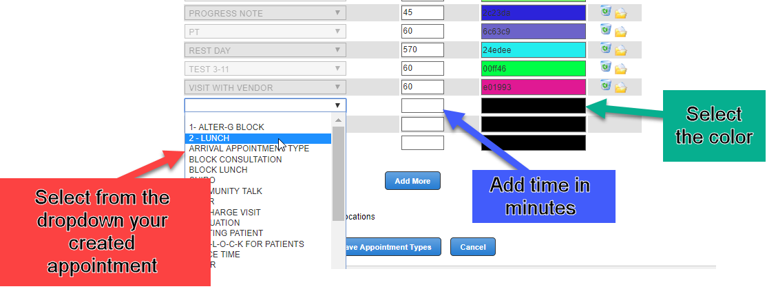 Select the appointment type that you want to set up, then add the duration for that appointment type and assign a color.