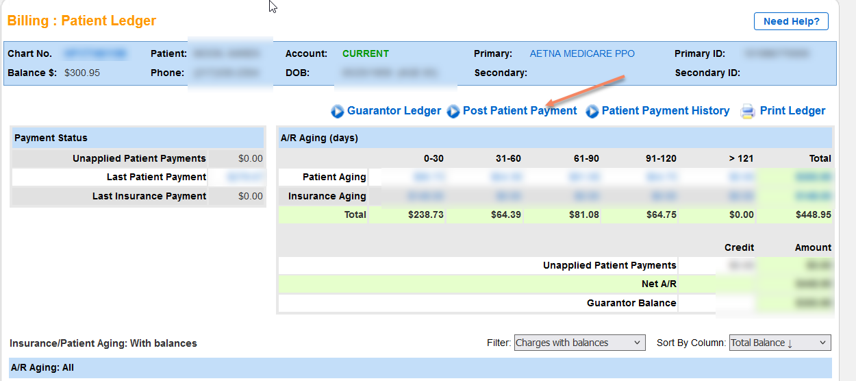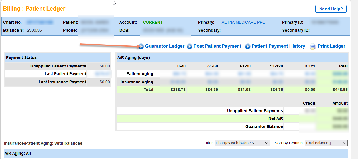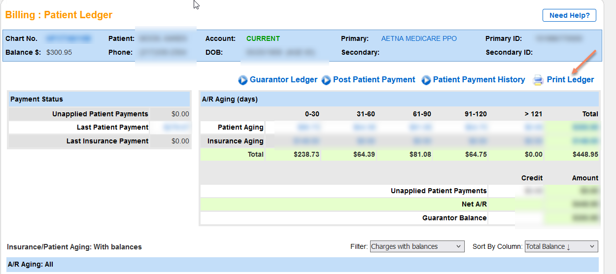 Use the Patient Ledger feature to view a patient’s charge and payment history. Review this help section for a thorough understanding of the Patient Ledger’s functionality.