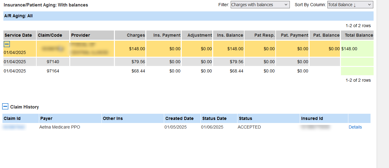 After clicking the blue “+” icon for Claim History, all claims associated to the charge display. This includes resubmitted claims and secondary claims. To display Claim Notes and the Activity Log, click Details.