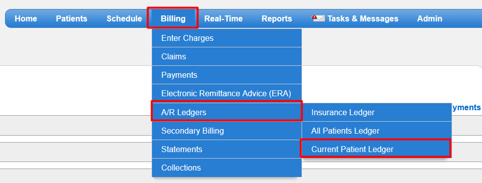 Hover over Billing on the menu bar, select A/R Ledgers, and then click Current Patient Ledger.