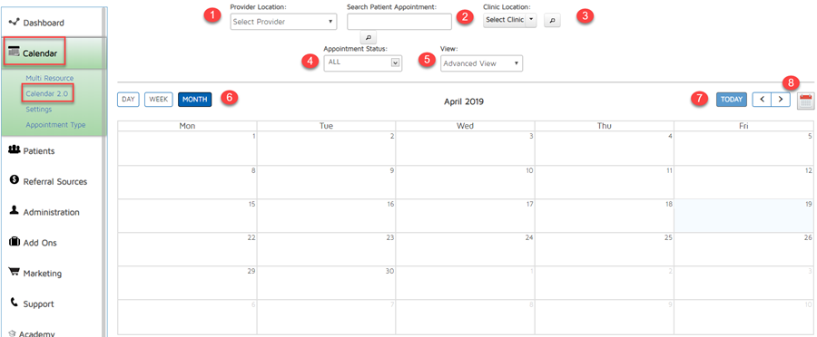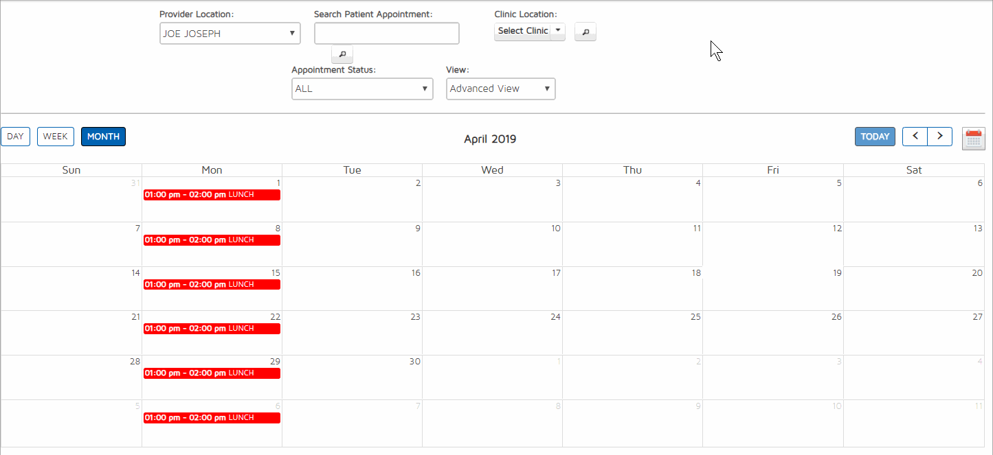 - Provider - Choose which provider/clinician calendar you would like to view from this drop-down. For users that have classification as a clinician, whenever they click on the calendar, it automatically defaults to their own name. It will show their own calendar immediately. If they wish to see other people's calendar, they still have the option by choosing a different clinician name from the drop-down.