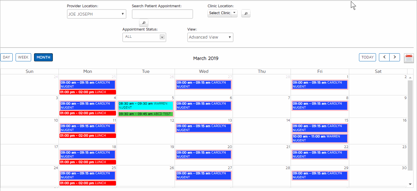 - Advanced View- This will show the color of both status (background color) and appointment type (border color).