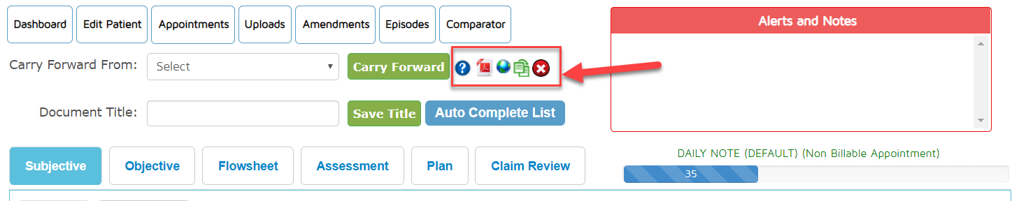 Inside the documentation below the Patient Dashboard Tabs and right next to the carry forward feature, you will see more options represented by these icons.