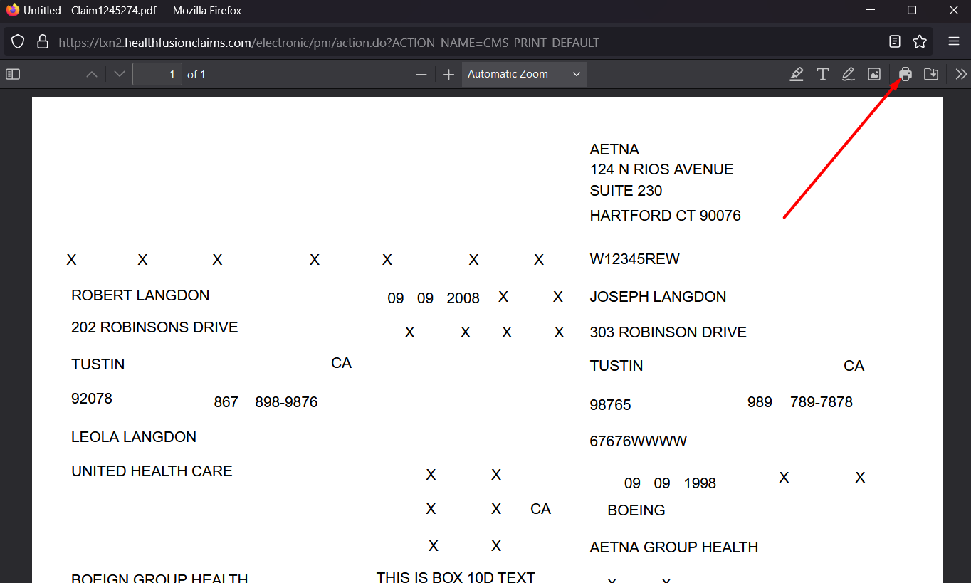 A PDF of the CMS-1500 claim form pops up. Click the Print icon on the PDF.