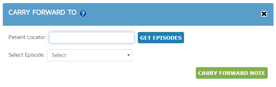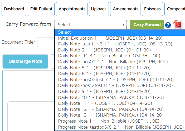 - Same Patient - Same Episode - If users do not want to follow the traditional patterns of carrying forward and wants to dictate manually which finalized document will be the foundation data for the new document, they can choose this way of carrying forward. Within the documentation section, there is an area at the top that has a Carry Forward From drop-down box. It will list all previous finalized documentation within the same Episode that the user can choose and then click the Carry Forward button. This will automatically show all the entries on the documentation selected to the current document in progress.