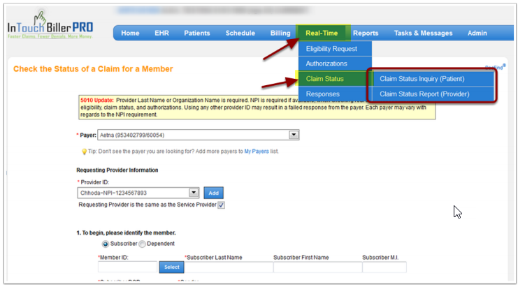 Choose "Claim Status" from the drop down menu and you will have the option to choose from: • Claim Status Inquiry (Patient) • Claim Status Report (Provider).