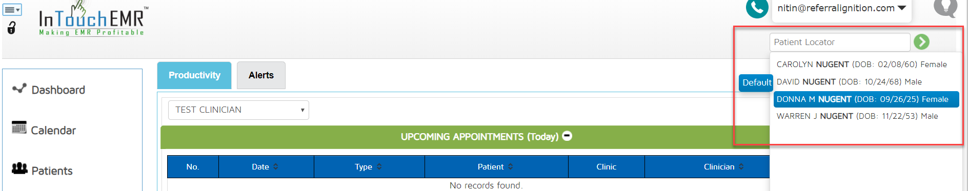 Wherever you are in In Touch EMR, you will be able to locate a patient easily since there is a patient locator in the upper right-hand corner of In Touch EMR.