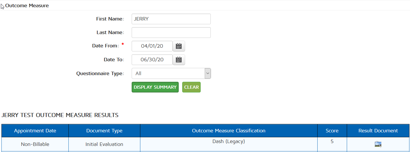 The Outcome Measure page will appear. The users can use the filters providers to search for a particular patient or dates.