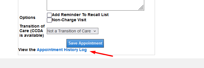 Click the "Appointment History Log" link to view history of the appointment, e.g. Created Date, Last Edited, etc.