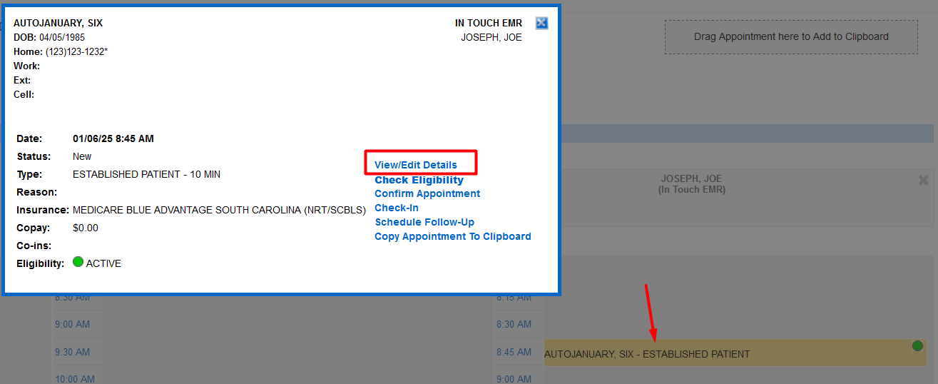 From the calendar, click the patient's name and then click "View/Edit Appointment."