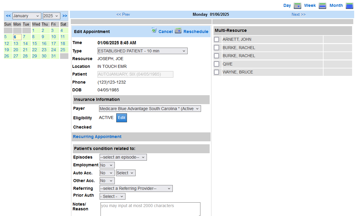 Appointment details, insurance information, and information regarding the patient's condition may be edited on this screen.