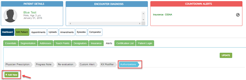 To add an authorization to the patient chart, click on Edit Patient. Go to the Alerts section in the Edit Patient tab and choose Authorizations.