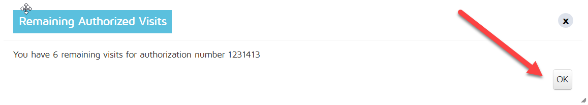 Once the authorization number has been choosen, it will provide a notification pop-up with the remaining number of visits.