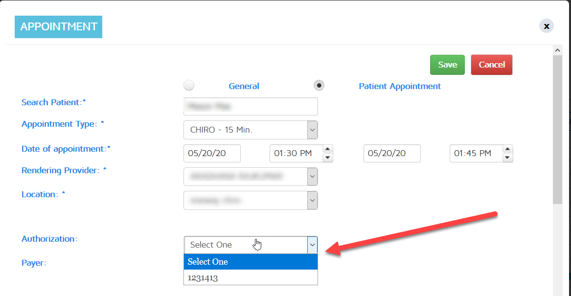 During the appointment creation in the pop-up, there is an area for authorization.