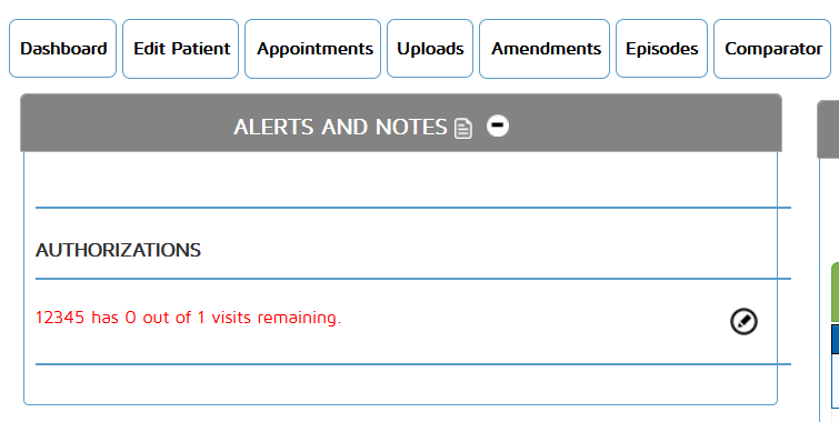 If there's no visits remaining on the authorization, the alert will be in red.