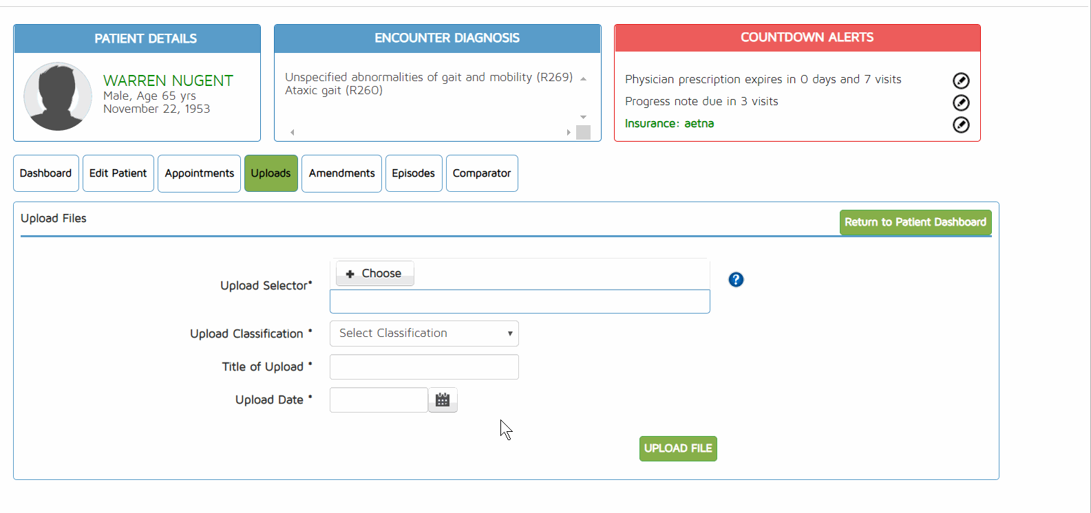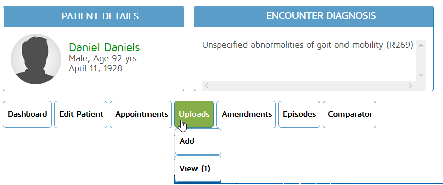 To upload documents to a patient file, go to the Patient Dashboard, and hover on the Uploads tab at the top. You will then be given two options: ADD or VIEW