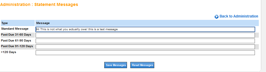 This default message appears in all patient statements. The next four messages are AR aging messages.