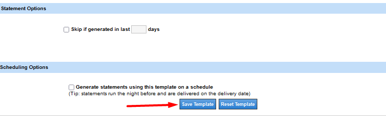 - You can skip generating statements for a selected number of days. Under Statement Options, select the Skip if generated in last x days check box and type the number of days.