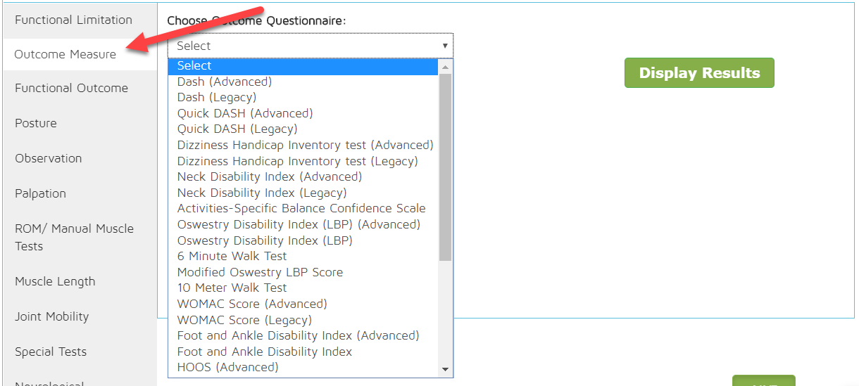 In this section, you will see a drop-down list of different Outcome measure questionnaires.