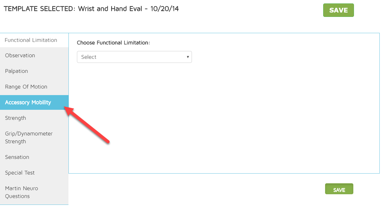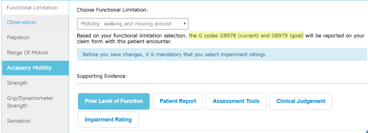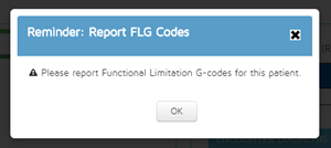 This section is crucial for Medicare patients. The system will automatically prompt you when Functional Limitation is required for the note type you have selected (Initial Evaluation, Progress Note and Re-Evaluation). There will be a pop-up showing the moment you start a new document reminding users to report FLG codes.