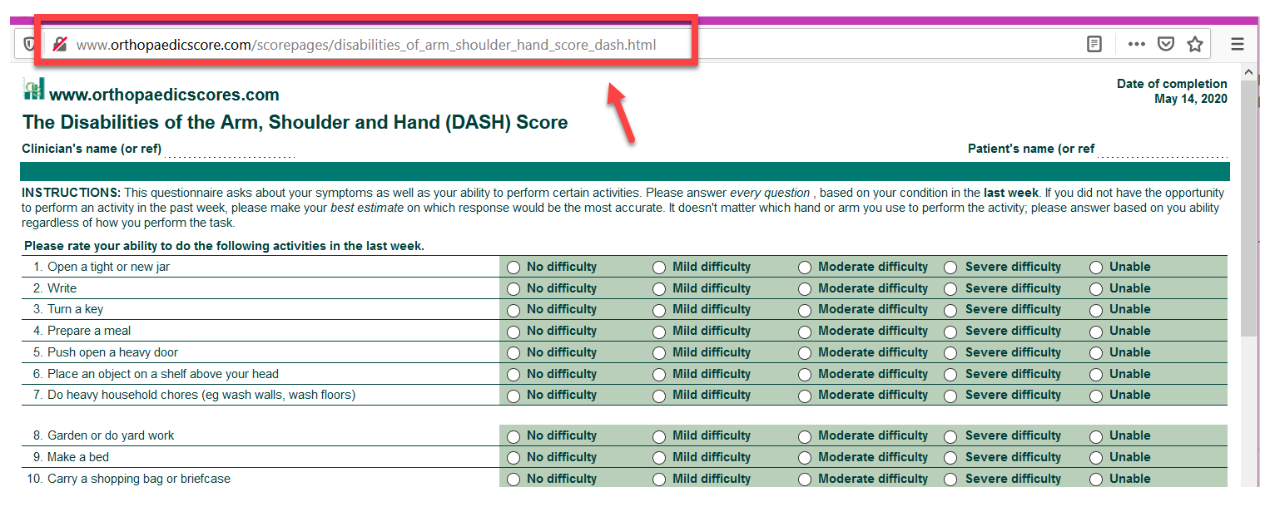 Once you click the link, a pop up will appear leading you to the orthopaedicscore.com.website. Provide this URL to the patient for them to fill out the questions.