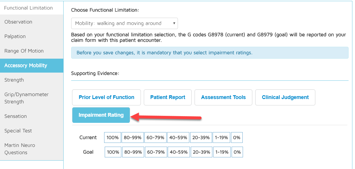 IMPORTANT NOTE: The Impairment Rating tab is a necessary field. The Functional Limitation section will not save until the user chooses an option in the Impairment Rating tab. There are 2 areas that needs an entry, the Current and Goal. It will show percentage options that the user can click one option each for Current and Goal.