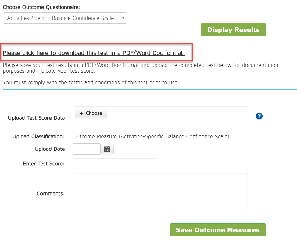 PDF / Word Format - There are some outcome measure options that will have only a PDF and Word document that will provide clinicians how to do the test and properly provide a score. When clicked, it will download a PDF or Word document to the user's computer. This will not automatically provide a score or a questionnaire. The user must do the instructions on the test and enter the score on the EMR page.