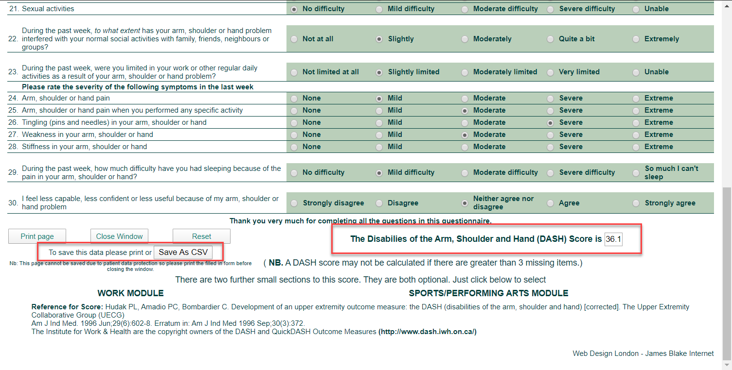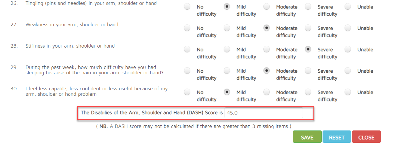 Unlike the Orthopaedicscore.com questionnaire, the user no longer need to copy and enter the score. Just click on the Display Results button and the score will appear on the documentation right away.