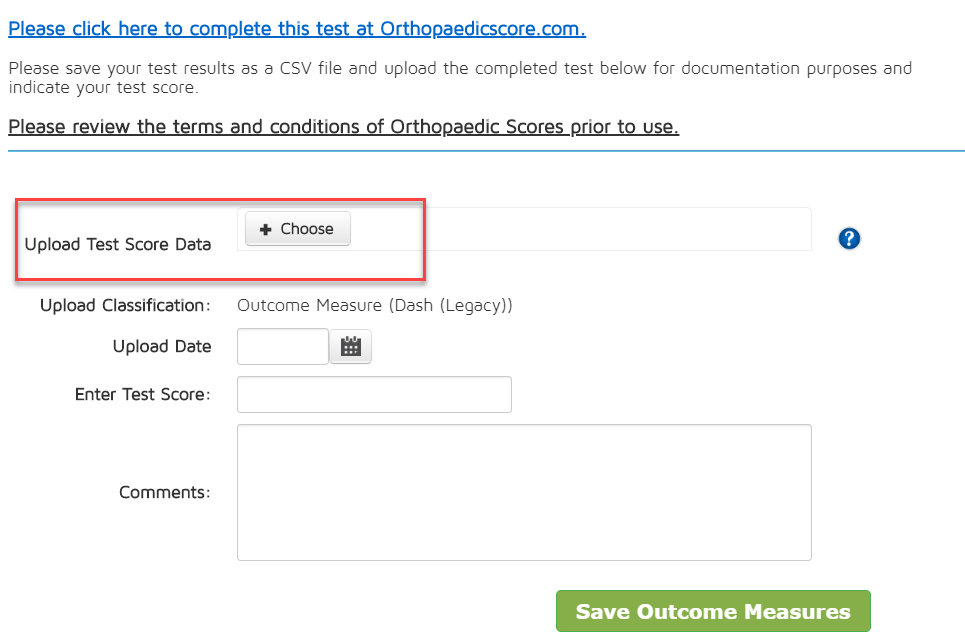 Once the clinician receives the document from the patient, he has the option to upload the actual test on the patient chart by clicking Upload Test score data. This can be skipped if desired.