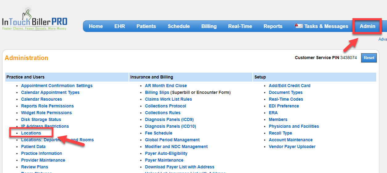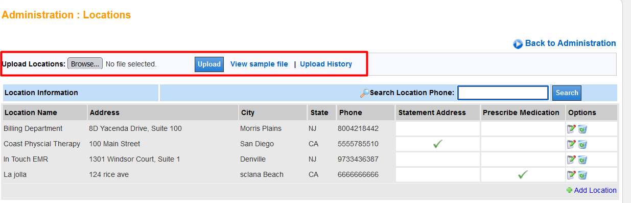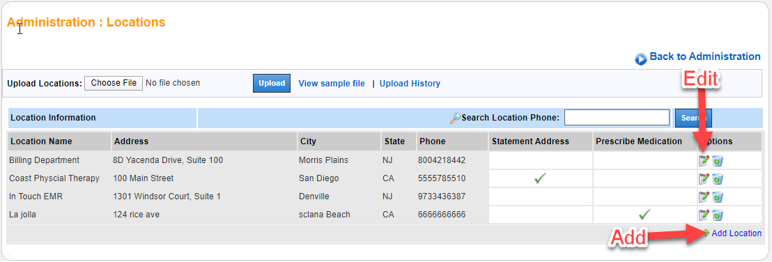 The Locations administration page is where you enter all necessary address information for your clinics. This address information is used for scheduling, charge entry options, claims/reporting, and print and mail statements.