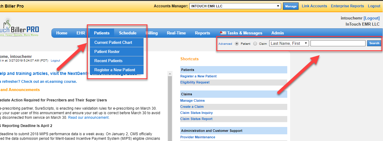 - Search for the name of the patient. You can use either use the Patient tab or the Advanced Search tab. Click on the Patient's name to go the Patient's dashboard.